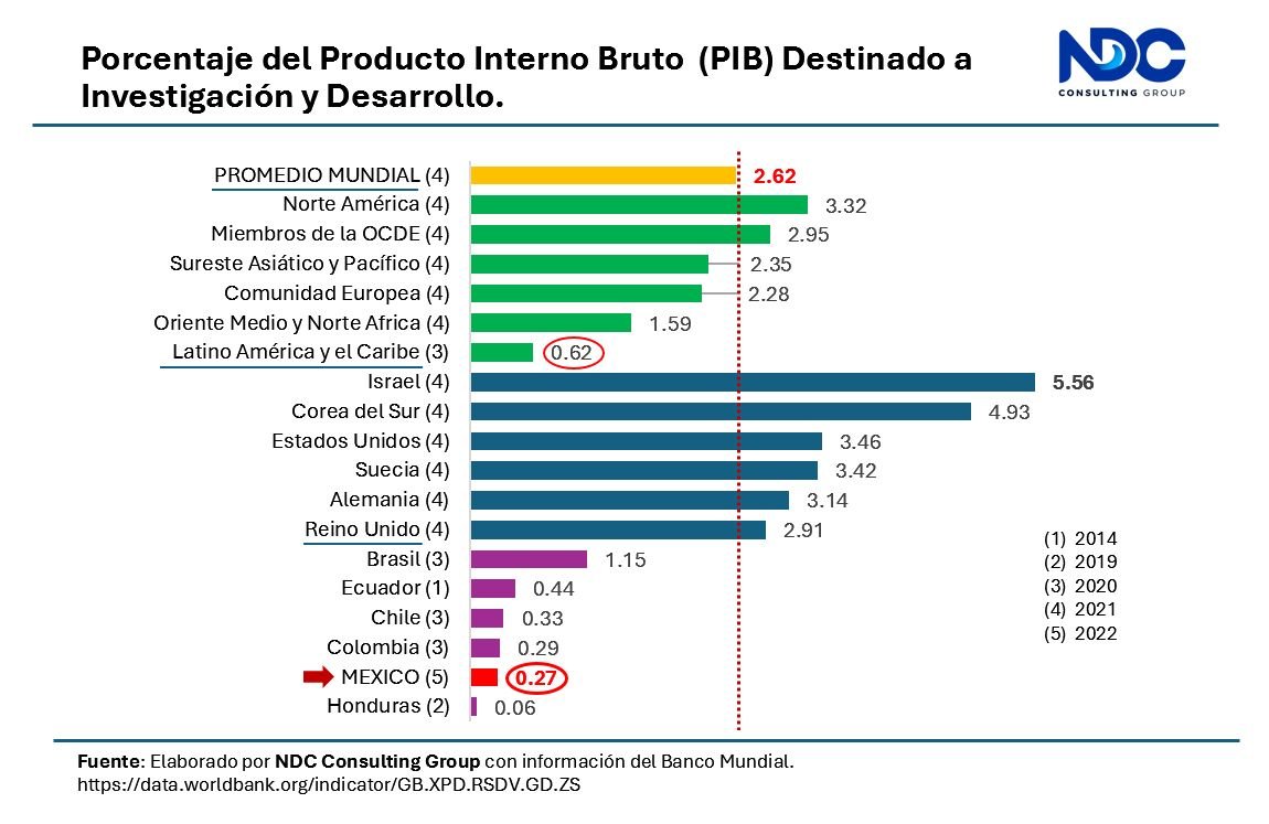 Los datos para Latinoamérica contrastan con el promedio mundial, ya que la región destina solo el 0.67% de su PIB, esto es, 75% abajo del promedio mundial. Con respecto a México, que en el año 2022 destinó solamente el 0.27% de su PIB para promover la I&D la situación es aún más contrastante.